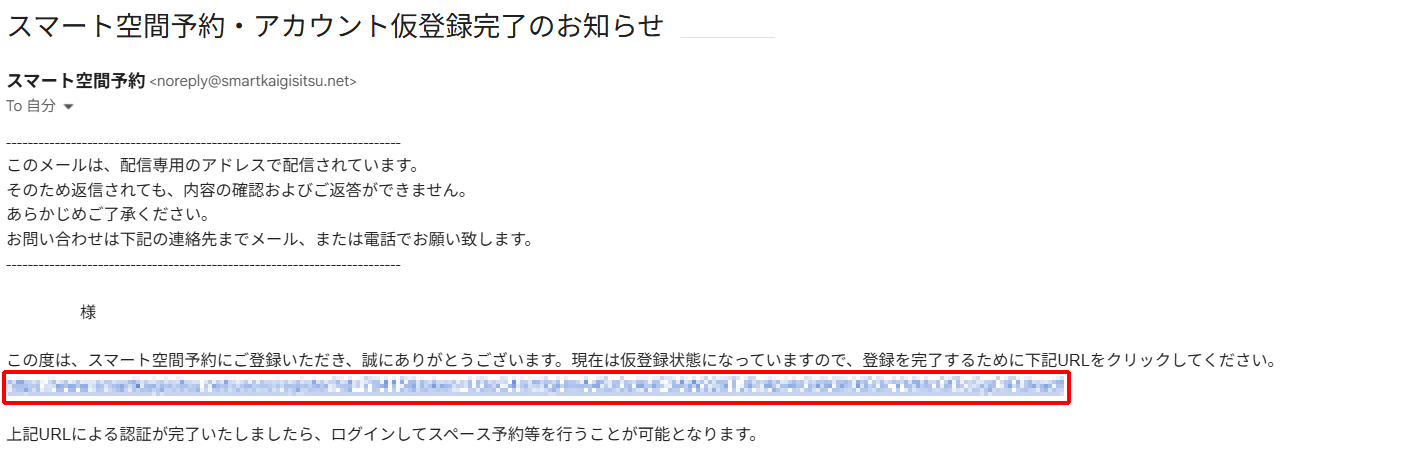 予約サイトから「スマート空間予約・アカウント仮登録完了のお知らせ」というメールが届きます。