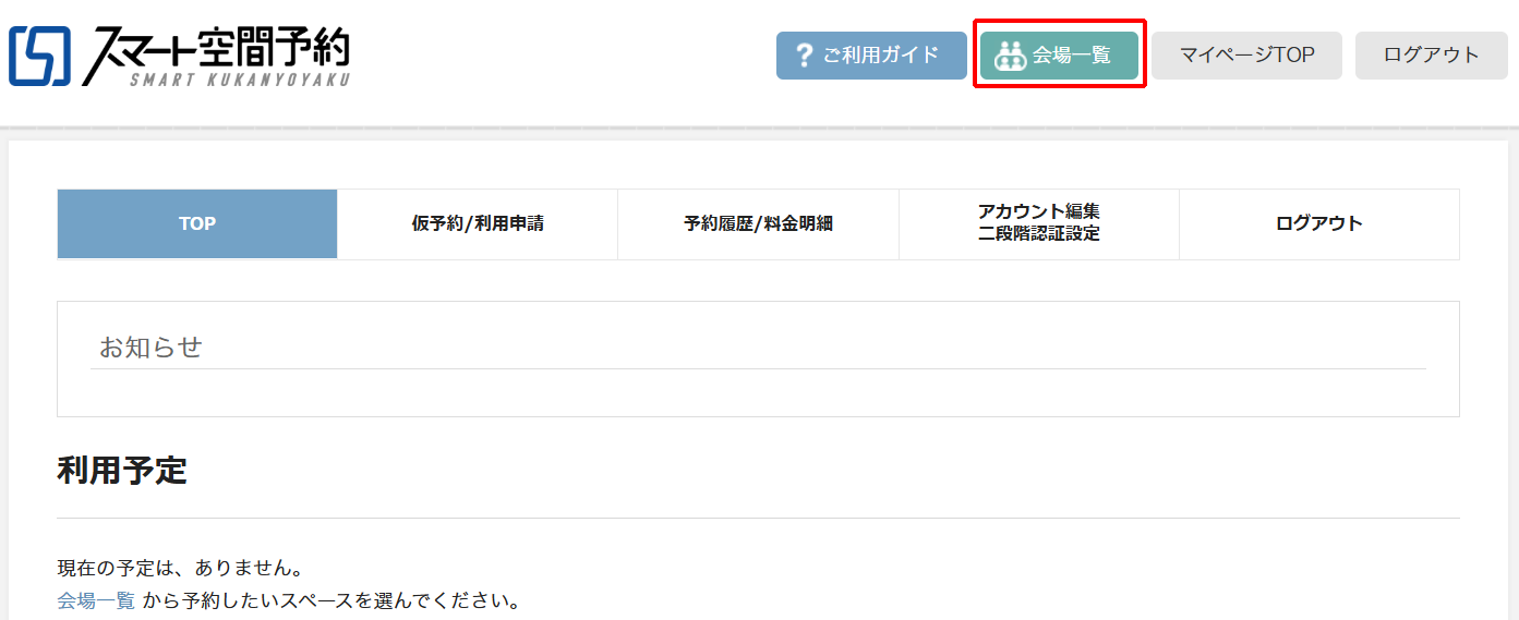 予約サイトにログインしていただくと下記の画面になります。