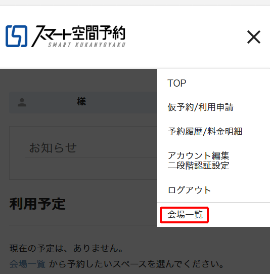 画面右上のを押し、最下部の「会場一覧」を押してください。