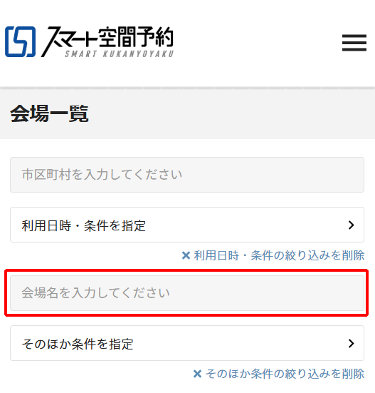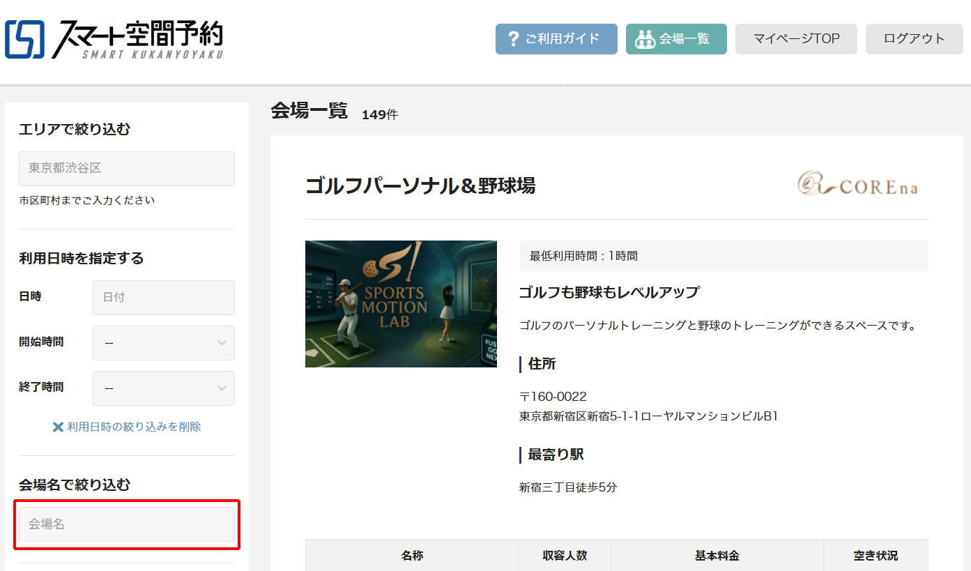 画面左側に「会場名で絞り込む」の検索窓があります。