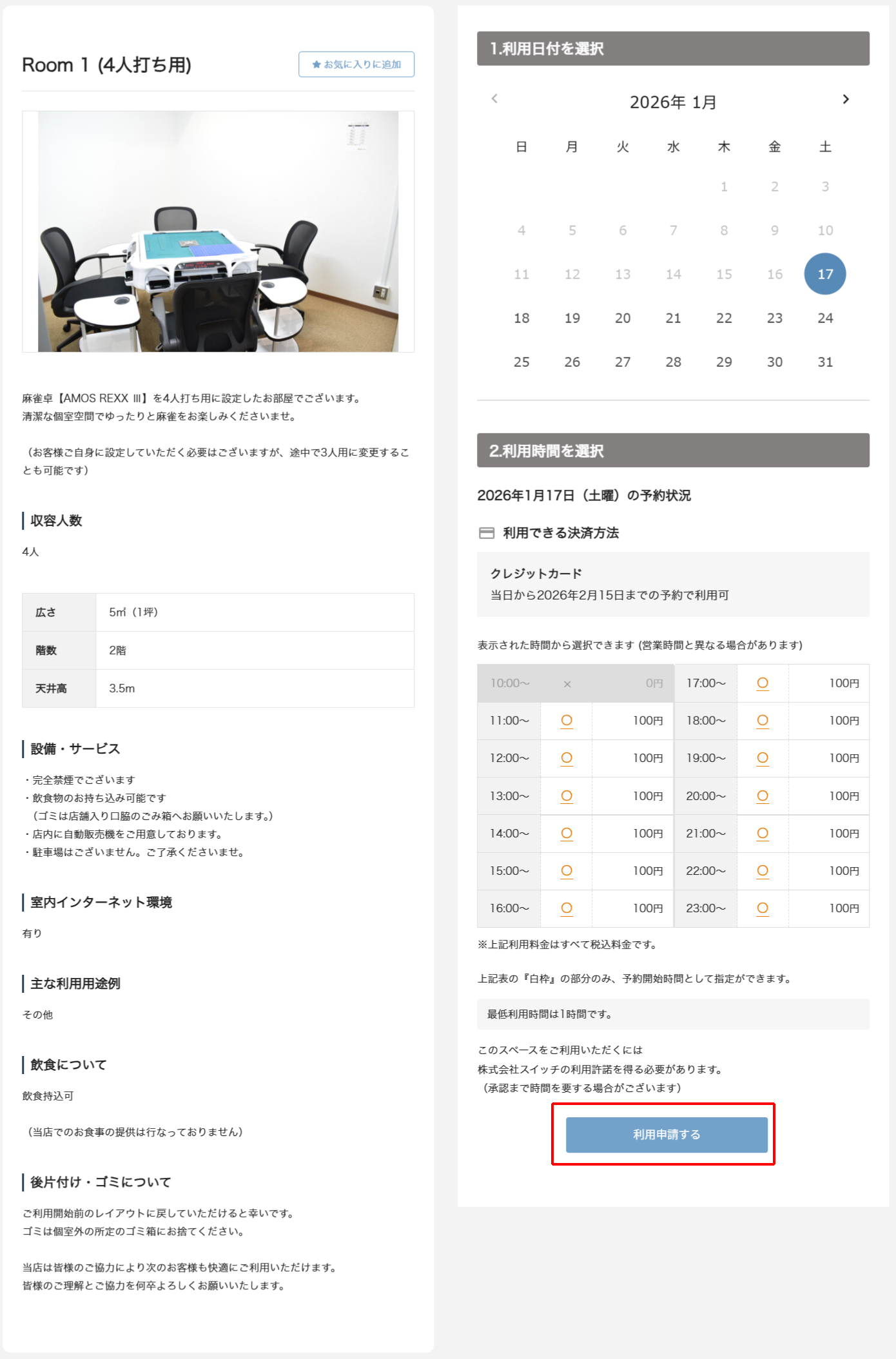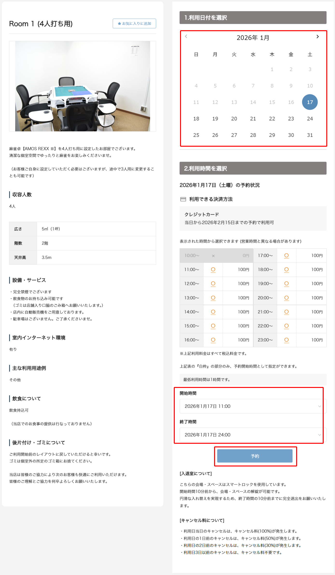 ご利用開始日・開始時間・終了時間をご選択のうえ、「予約」を押してください。