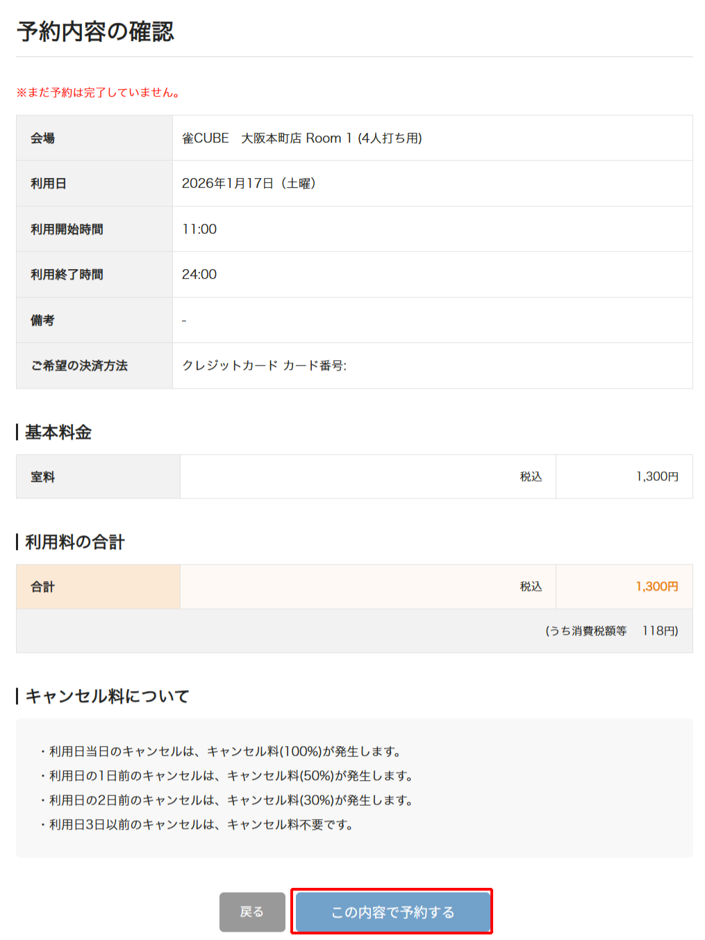 下記の予約確認画面が表示されますので、内容をご確認のうえ、「この内容で予約する」を押してご予約を完了してください。